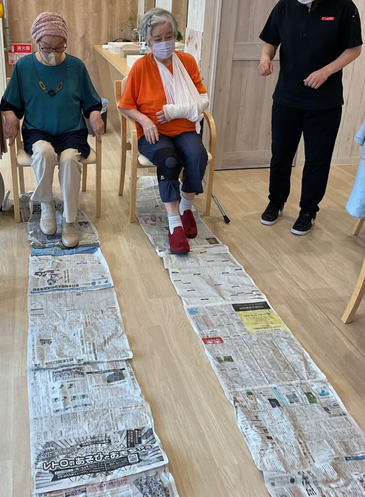 ボールを使ったバランスゲームや新聞紙を足で手繰り寄せて時間を競うゲームはいつも大盛況です(^O^)