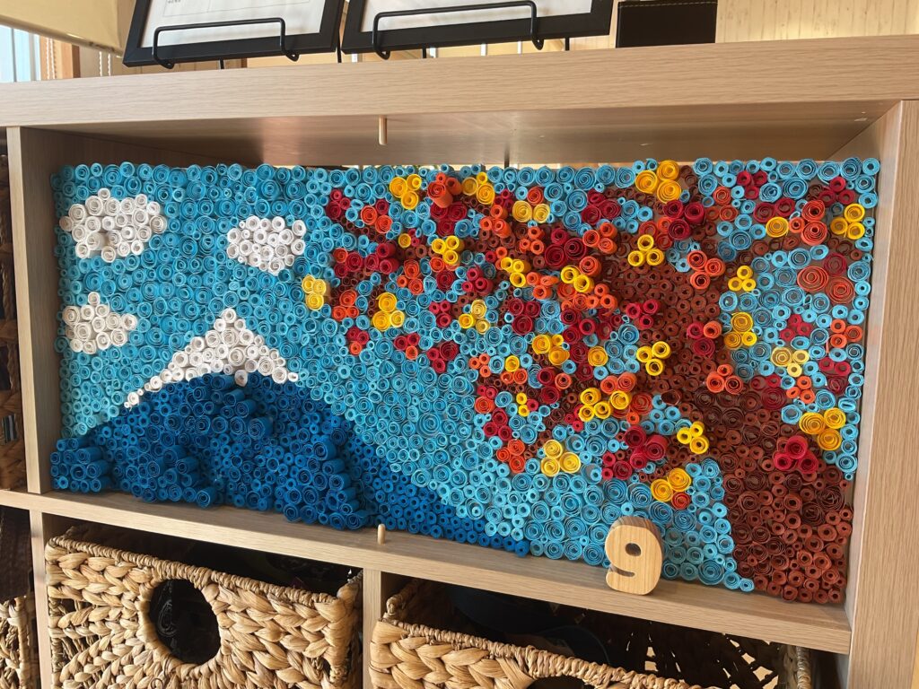 このペーパークイリングは1cmほどに細長く切った色画用紙を一本ずつ指で丸めて、貼り付けていきます。細かい作業になりますが、利用者さまを中心に、スタッフと協力しながら作成しました! 1ヶ月ほどの時間をかけて作成したので、完成した時の利用者さまの喜ばれる笑顔や達成感を感じられる姿を見ることができて、スタッフ一同心より嬉しく思っております。