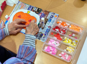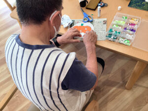 ご利用者さまは「かぼちゃ可愛いね🎃」「いい色やねぇ🌈」と楽しみながら、男性の利用者さまも一緒に作成に参加してくださいました。