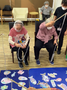 Let’sリハ!渡辺通では利用者さまと一緒に作成した魚にクリップをつけ、磁石付きの釣り竿で釣り上げていただきました✨