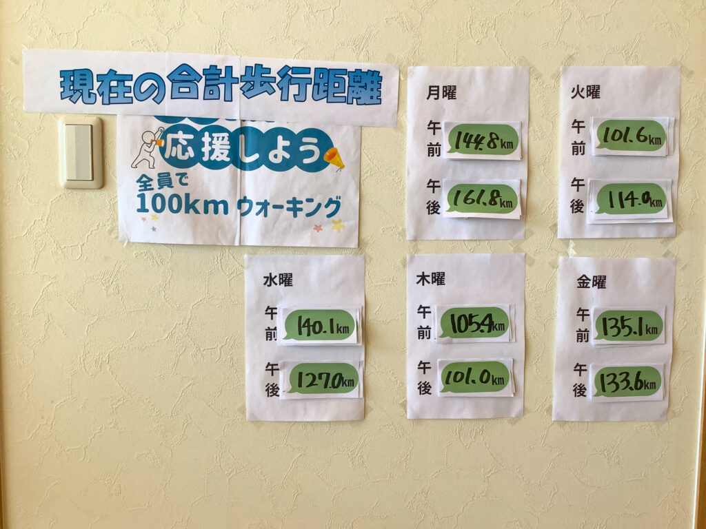 完歩後には朝の準備体操の時間に報告を行い、ご利用者さまから「おめでとう!」「すごいね!」と温かい拍手と労いの言葉をいただき、会場は笑顔でいっぱいになりました🌈