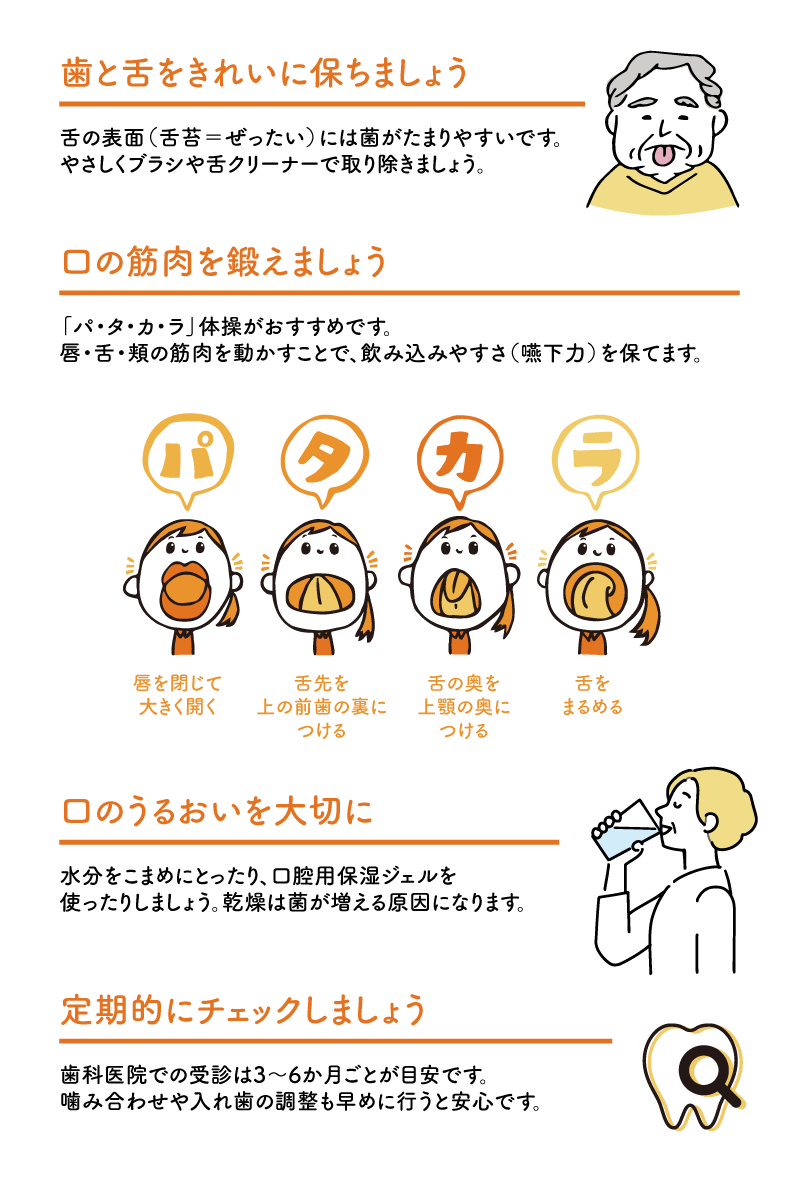 飲み込む力の低下で誤嚥が起きやすくなり、お口の細菌が肺に入ると肺炎につながることがあります。