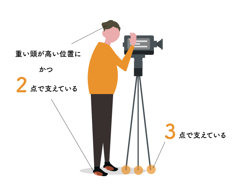 (介護予防コラム9または介護予防コラム61で詳しく紹介していますので、ぜひ参考にされてください。)本来、三脚のように3点で地面を支えていると安定します。しかし人間は、直立二足歩行のため地面と接しているのは2点のみです。