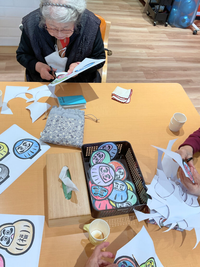 神社の上には、利用者さまと一緒に制作しただるまの壁面飾りが飾られ、施設内は明るく華やかな雰囲気に包まれていました🎨🌟