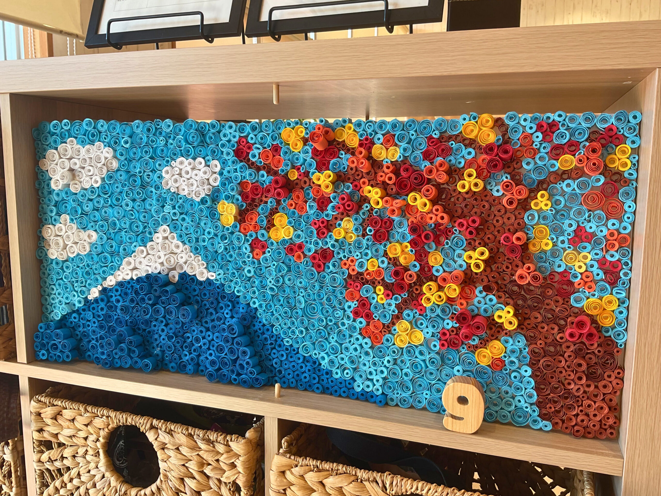 紙を丁寧に巻いて作り上げた色鮮やかな作品では、配置や色の組み合わせを考えながら作業を進めていきます。