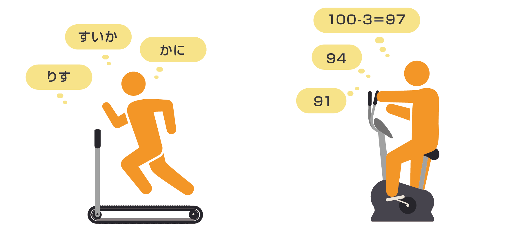 エアロバイクやウォーキングマシンが自宅にある方は、計算やしりとりなど考えながら一緒にそのような機器を活用すると有酸素運動と組み合わせた効果的な運動ができます。
