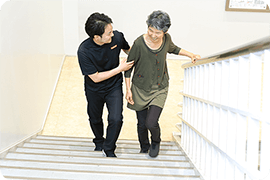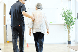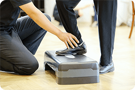 実際の動作や模擬動作を通して、動作に必要な機能を維持・向上し、最終的には動作を円滑に行えることを目的としたトレーニングです。 ![]()  歩行練習 足運びの改善を目的としたラダー歩行訓練では、前後左右の重心移動をトレーニング。歩幅の調整をスムーズにする効果も見込めます。 ![]()  バランス練習 柔らかいマット上に立つことで、足指の力を鍛えてバランス力をアップします。砂利道などデコボコのある地面を歩く訓練になります。 ![]()  段差昇降 階段の昇り降りを安全に行うことを目的として、下肢の筋力強化とバランスの両方をトレーニングします。